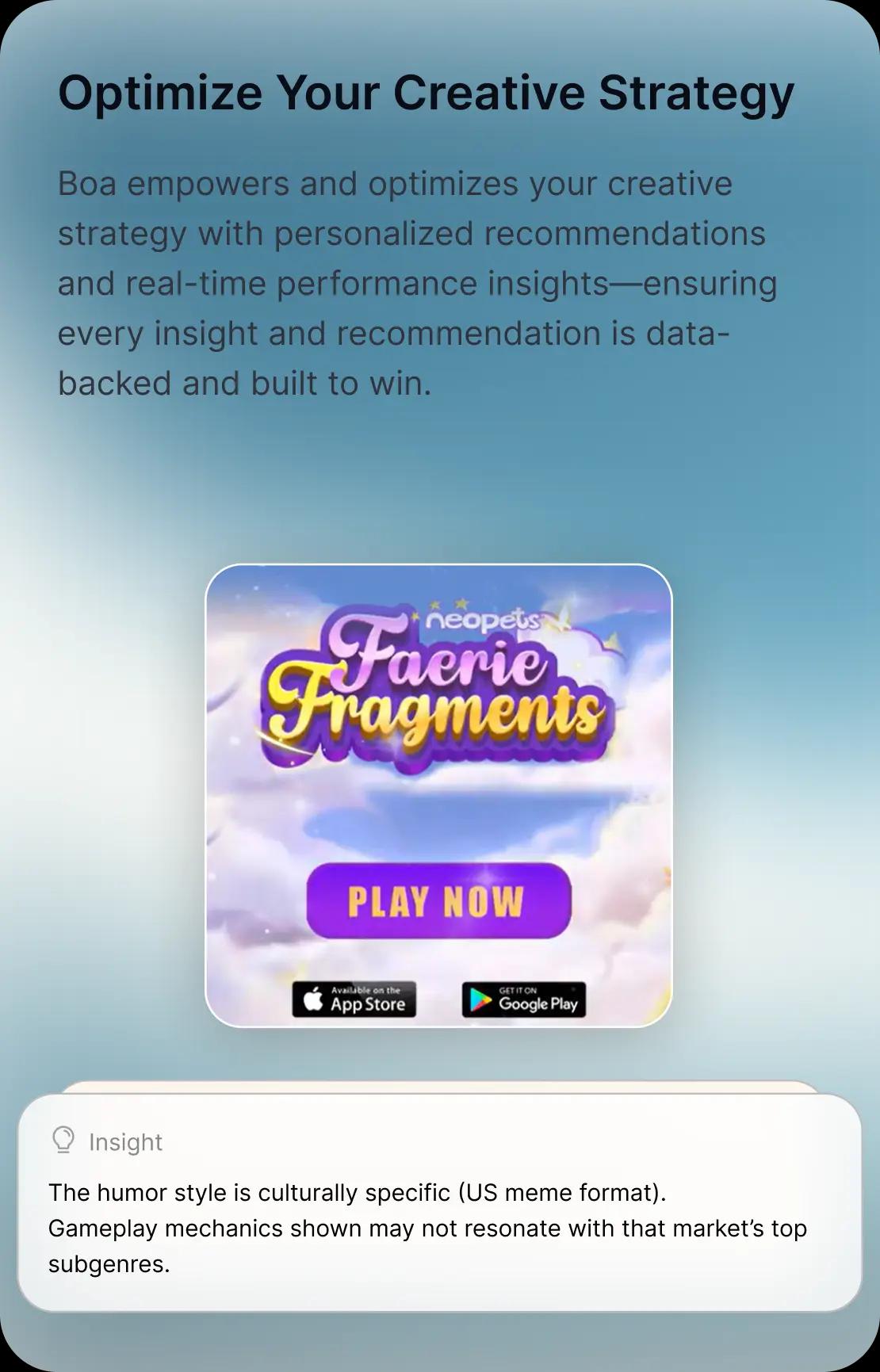 Integrate your first-party performance data to get automated insights and recommendations, so that every campaign is smarter than the last. With Boa, manual analysis and custom dashboards are a thing of the past.